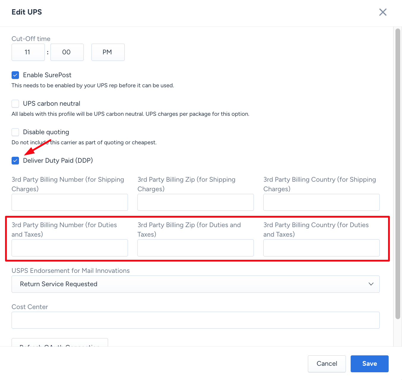 - Enable the DDP billing setting. For FedEx, set Payment Type to Sender. For UPS, select the Delivery Duty Paid (DDP) option.
