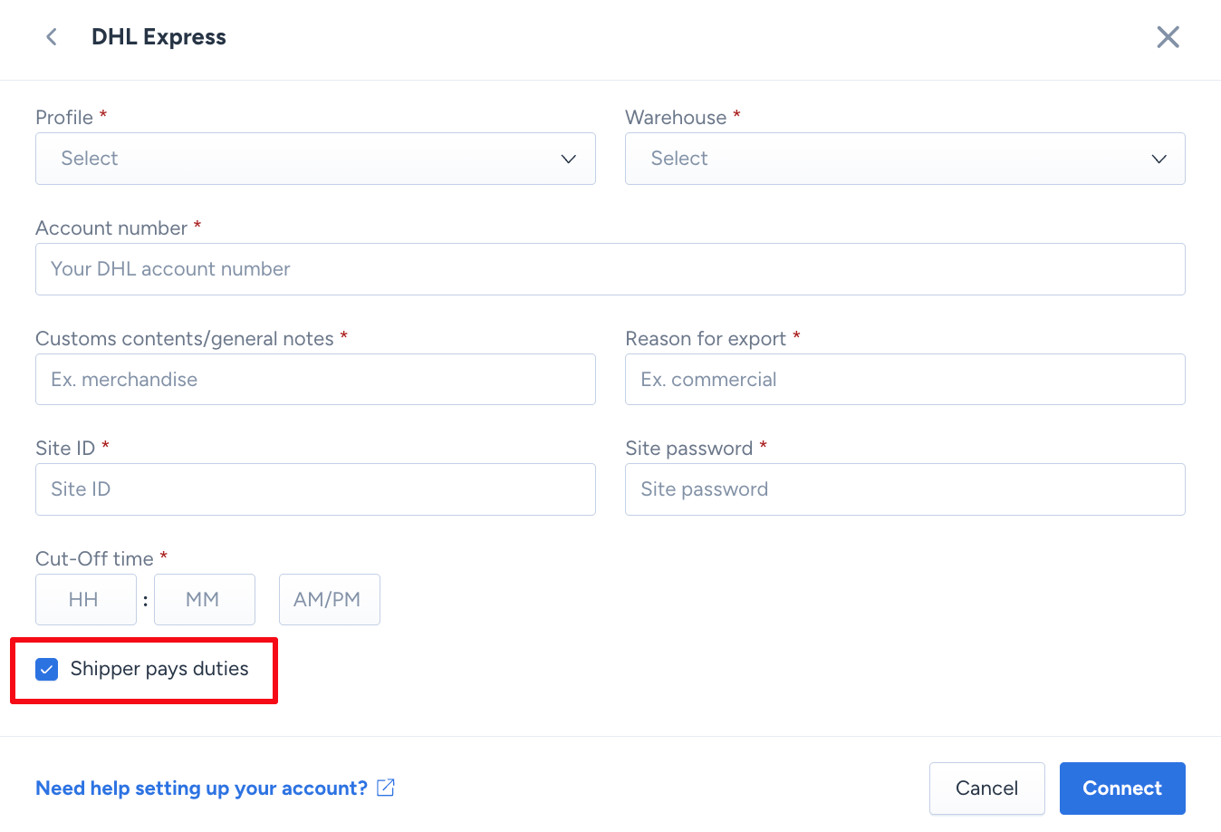 - Connect the carrier account to ShipHero using the unique shipper account information provided by Zonos to the custom profile for each warehouse you are shipping from.