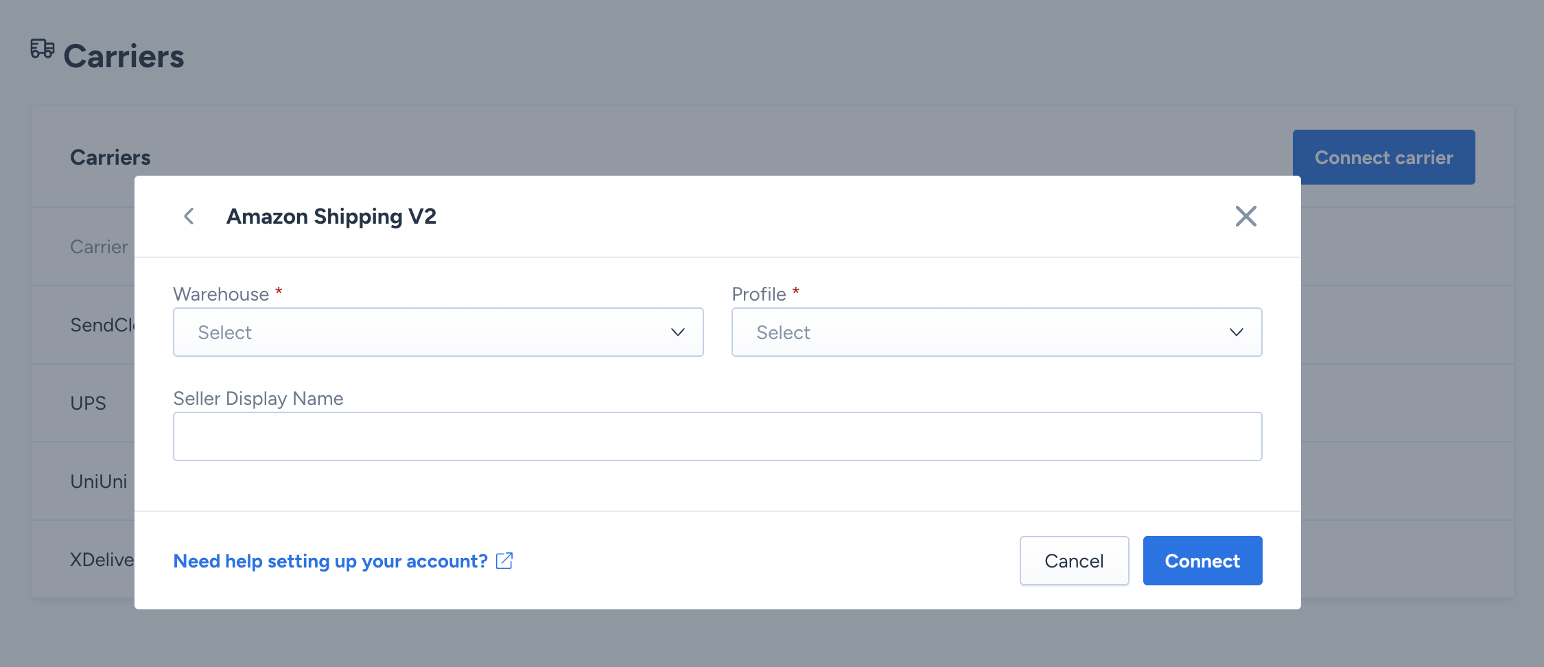- Click the Connect carrier button and select Amazon Shipping V2.