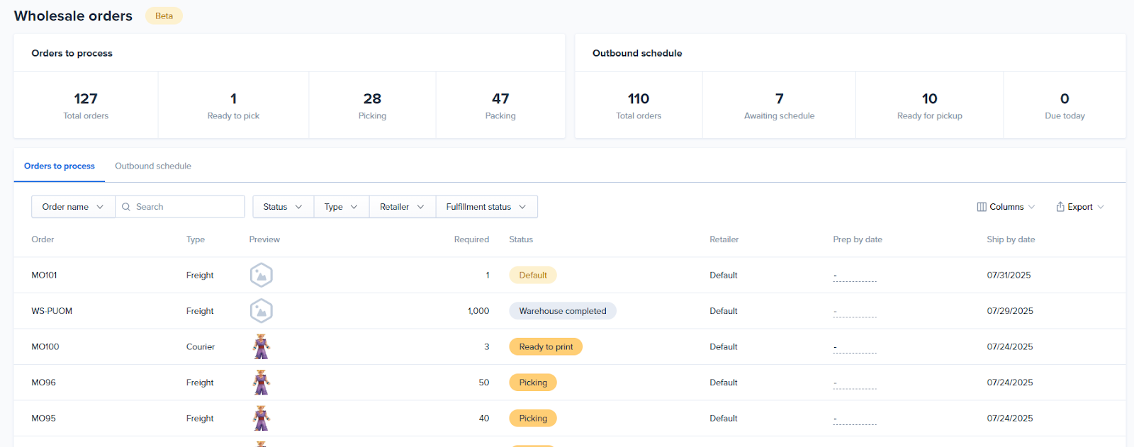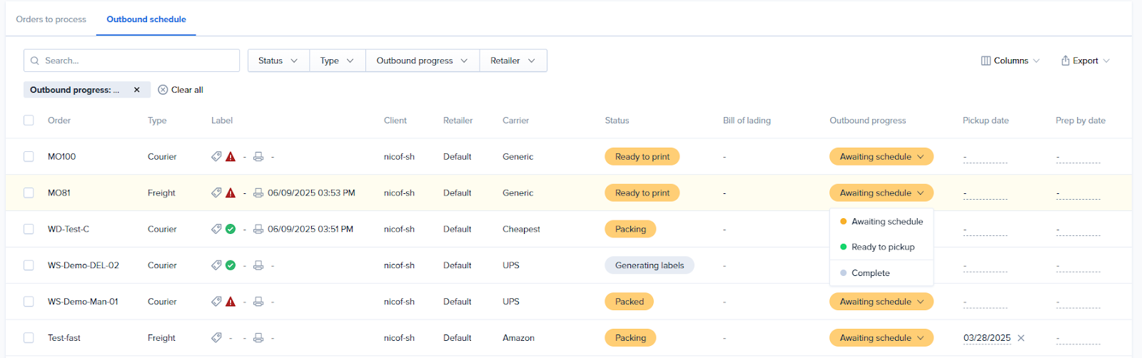 - Filters: Filter orders by Client (3PL accounts only), Status (wholesale order status), Type (Freight or Courier) Outbound Progress and Retailer.