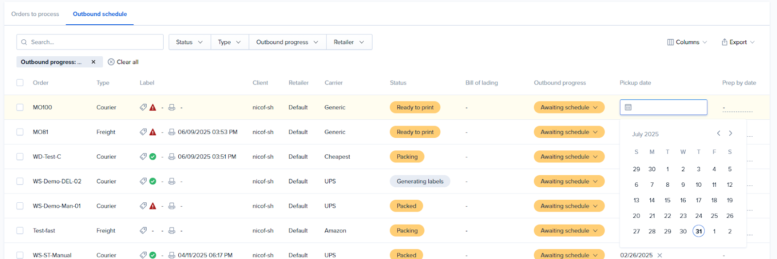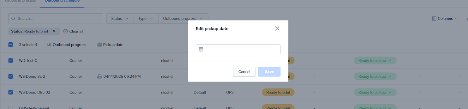 The list allows direct updates to outbound progress and pickup date you can edit these fields individually or in bulk.