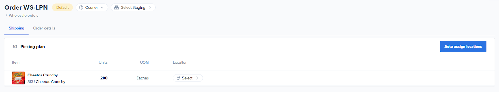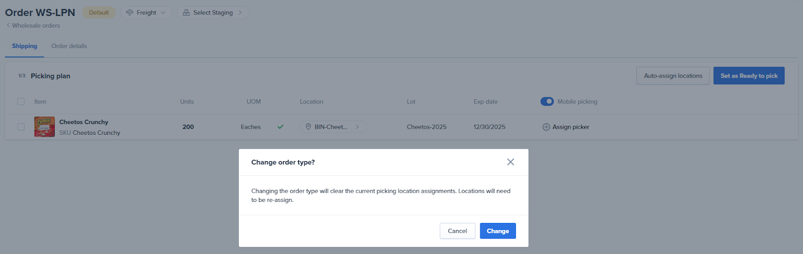 The wholesale flow offers two different order types, Freight and Courier. You can modify the Order Type for an order at any point before picking begins or after picking is completed, and up to when the order has the "Packed" status.
