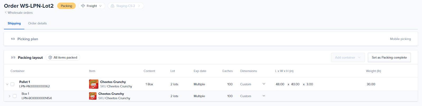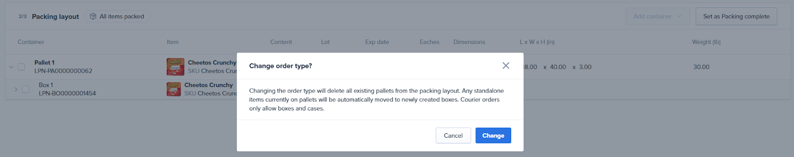 If you have already started packing items (meaning pallets and/or boxes are present in the packing layout) and then you change the order type, the system will automatically adjust the current packing configuration.
