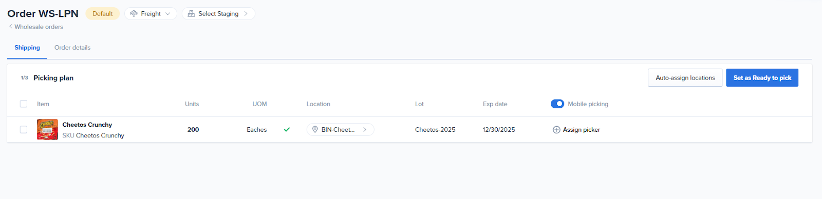 NOTE: If items were previously picked and moved to a staging location, they remain physically staged. During the Picking Plan assignment, users can choose to pick from the Staging location instead of from the original inventory locations.