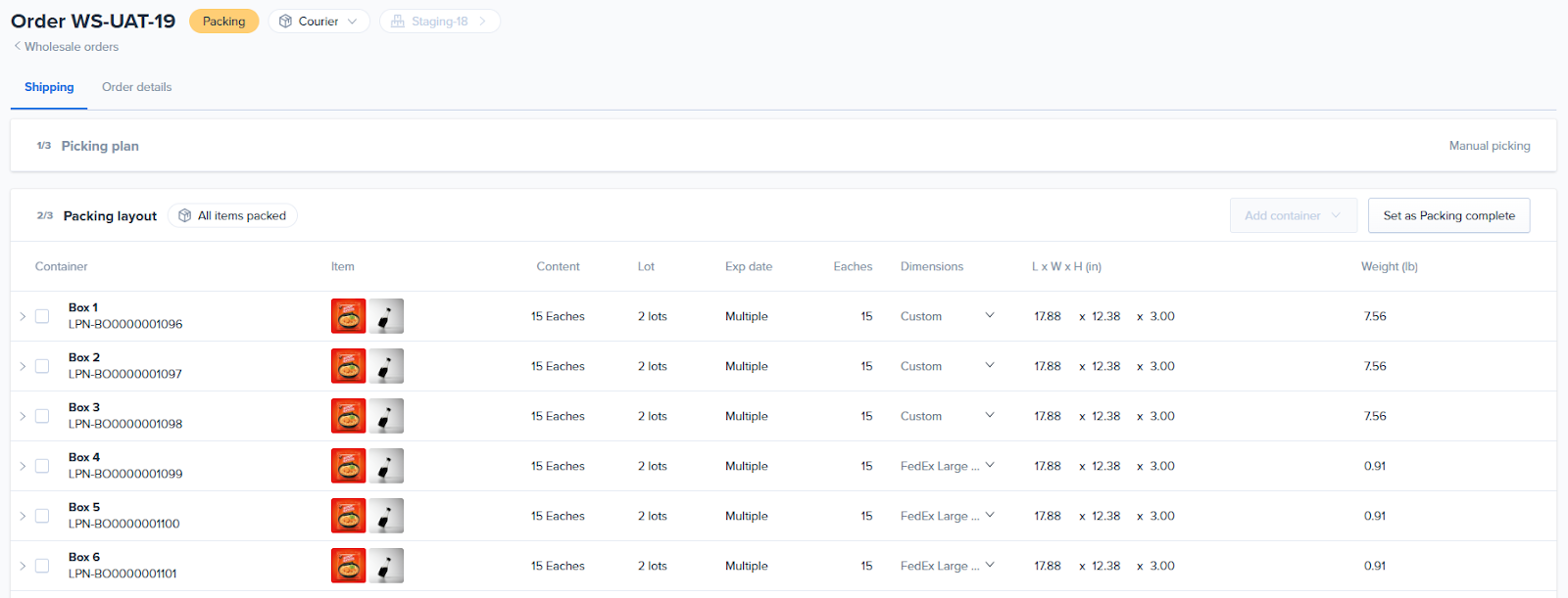 - All existing boxes currently shown in the packing layout (previously likely loose or designated differently under the Courier type) will be automatically moved and assigned inside this newly created Pallet.