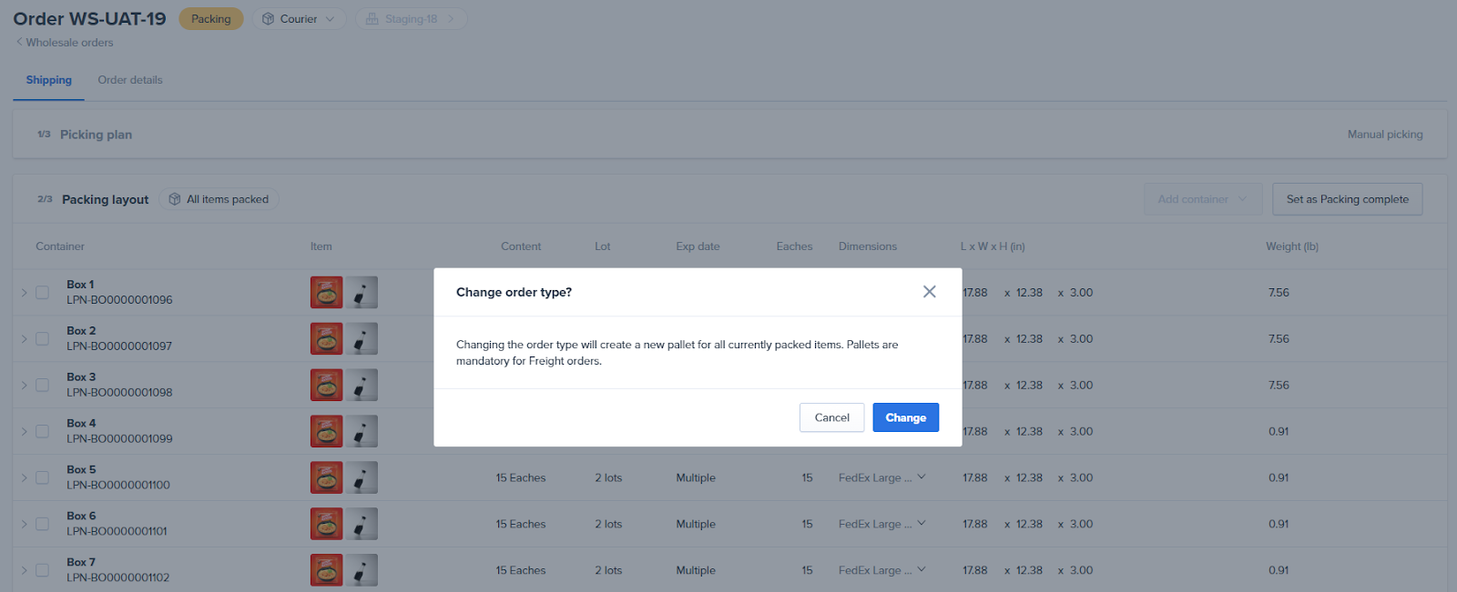 2. A prompt will appear with the following message, "Changing the order type will create a new pallet for all currently packed items. Pallets are mandatory for freight orders." Confirm the change by clicking Change or cancel the change by selecting the cancel button. |