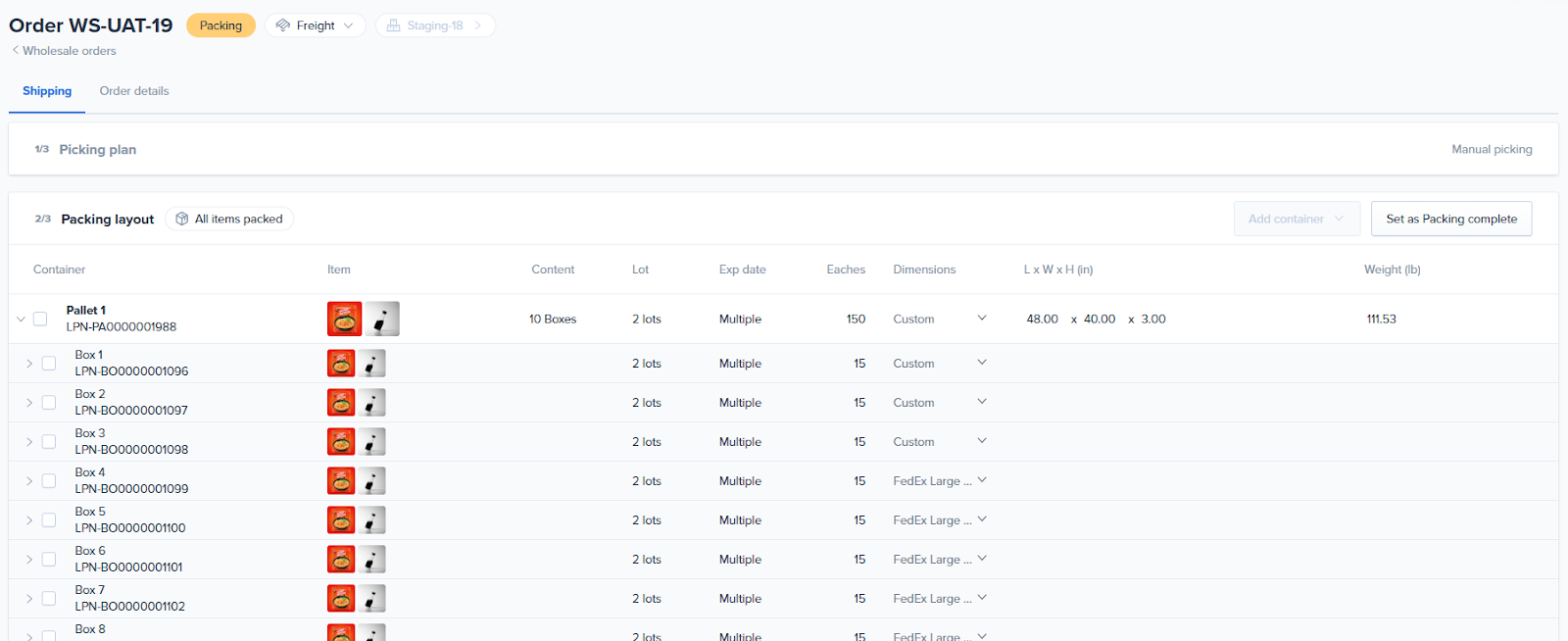 - After this automatic consolidation, you retain full flexibility: you can manually create additional Pallets if needed and rearrange the boxes between the available Pallets according to your packing requirements.