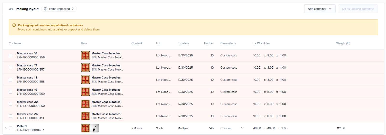 - Any boxes that were previously assigned to those Pallets will now appear as individual, loose Outer Boxes within the packing layout. They will no longer be grouped under a pallet structure.