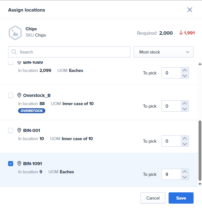 - If a selected location does not have enough inventory, a red arrow and the quantity remaining to be assigned will be displayed next to the required amount.