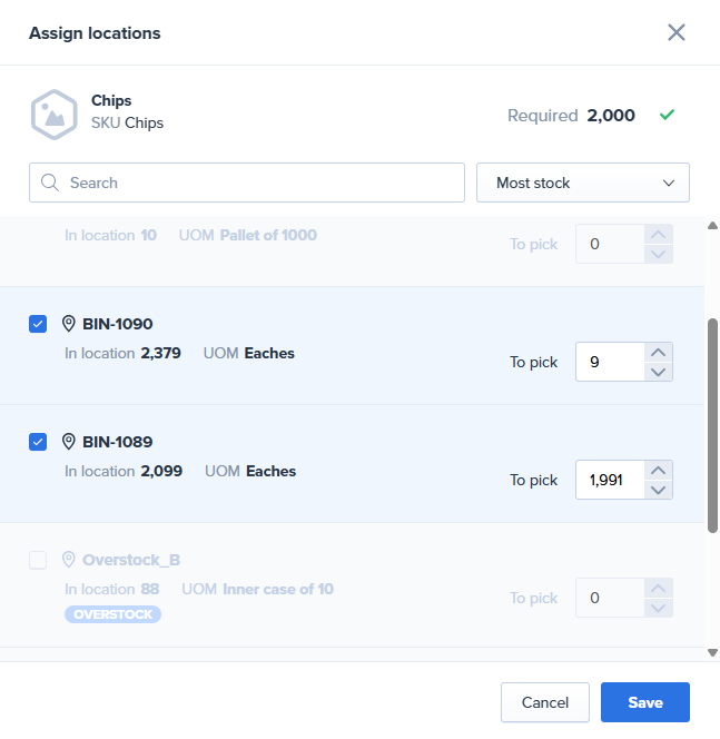 - Unit of Measure (UOM) SKUs: If the order was created with an 'Eaches' unit of measure SKU you can assign locations containing inventory with a unit of measure larger than eaches. If the order was created using an SKU with a unit of measure other than 'Eaches,' you can only assign locations with that same unit of measure.