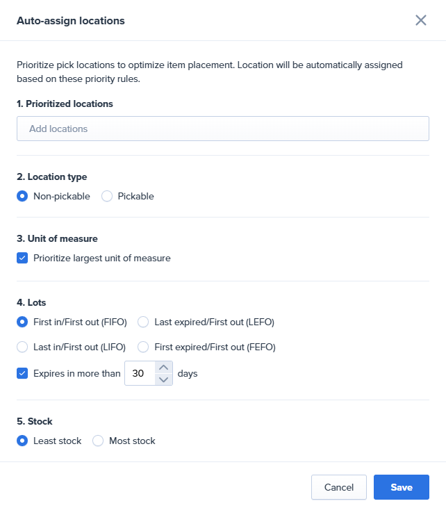 4a. Lots: location assignment is prioritized based on the selected lots priority (FIFO, LIFO, LEFO, FEFO). 4b. Expires in X Days: Only considers locations that meet this expiration date criteria. (Only impacts Lot controlled SKUs) | |