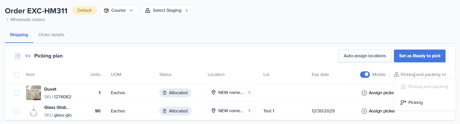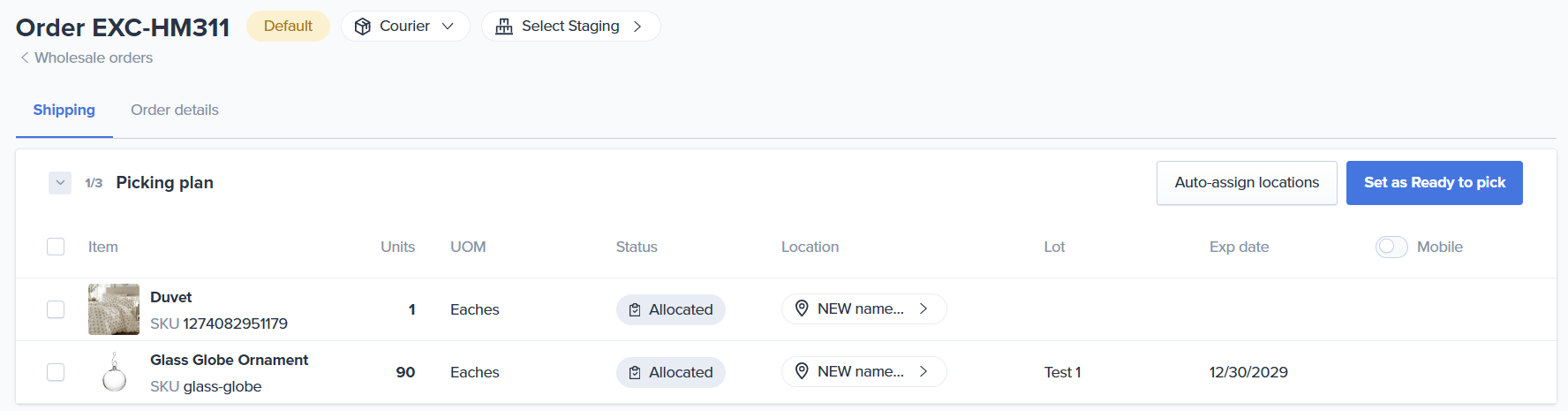 - Courier Orders Eaches and Cases ONLY: If a wholesale order has a Courier order type, you cannot assign locations containing SKUs with a Pallet UOM. You must first break down the pallet UOM into cases before assigning the location. For more information on working with units of measure visit our article How to use Unit of Measures (UOMs)