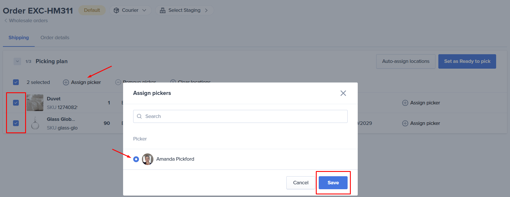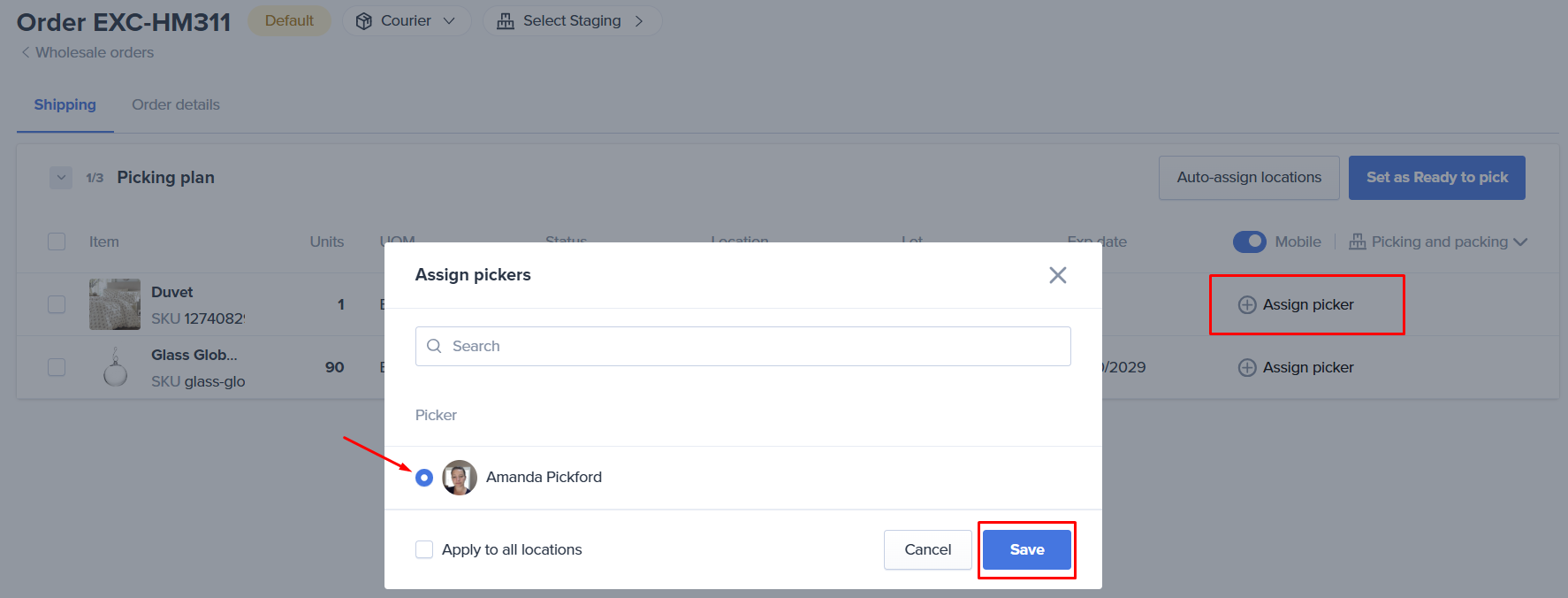 You have the option to assign specific pickers to each location on the wholesale order. This allows you to manage the workflow that is best for your team. For example, if some items require a forklift operator while others are floor loaded, you can divide the work, assigning specific tasks/locations to the qualified personnel.