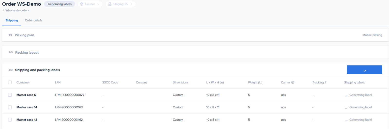 - While the labels are generating, the order status will be temporarily updated to Generating labels with a circular icon indicating the generation process is running.