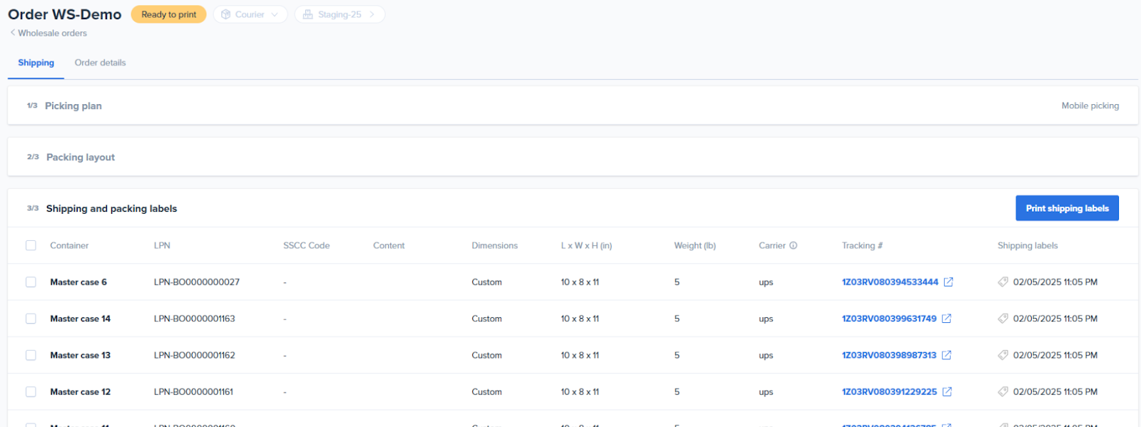 When the label generation process is complete, the order status automatically updates to Ready to print. For each box a label was generated for the following information will be displayed: