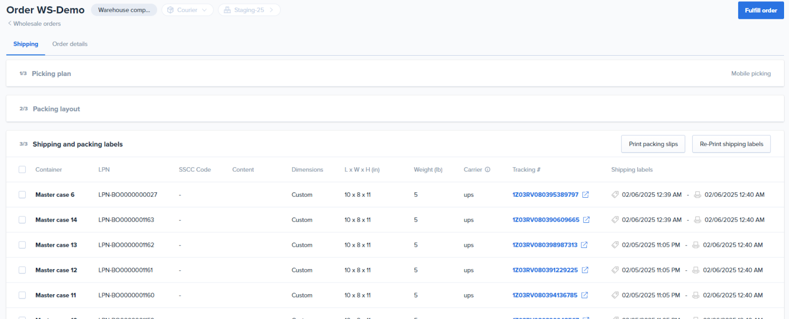 Select Print Shipping labels. This generates a PDF with all required labels, each referencing the Box ID of the box it should be placed on, and updates the order status to Warehouse Complete, making the Fulfill order option available.
