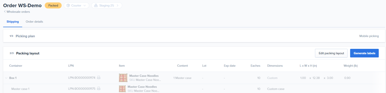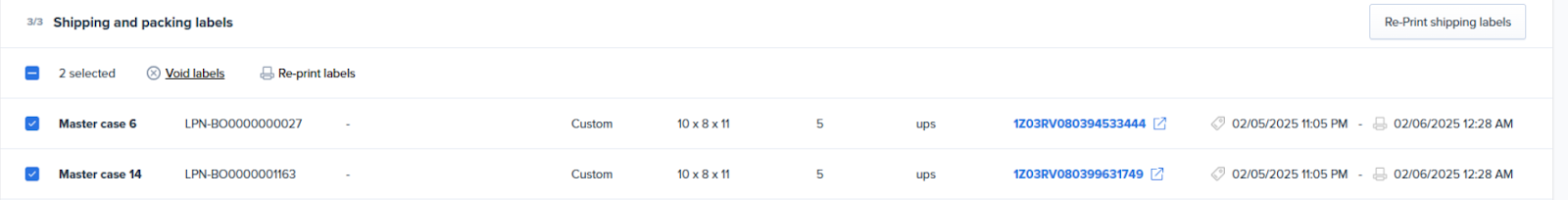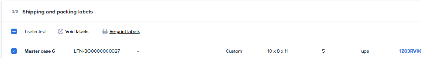 Once the necessary changes have been made, the order can be marked as Packing complete again and the labels can be generated again (only labels will be generated for the boxes that do not contain valid labels).