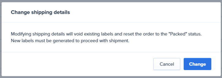 NOTE: If any of the values are changed after the labels have already been generated, you will receive the following prompt, "Modifying shipping details will void existing labels and reset the order status to the Packed status. New labels must be generated to proceed with shipment."