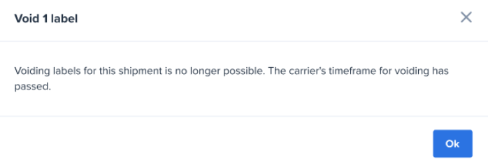 NOTE: Depending on each carrier, the void may not be possible if the time between label generation and the void attempt was too long and you will receive the prompt "Voiding labels for this shipment is no longer possible. The carriers timeframe for voiding has passed."