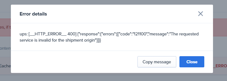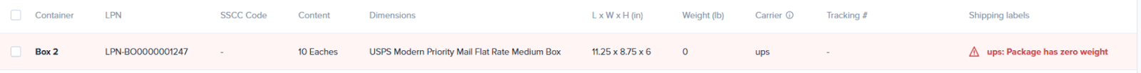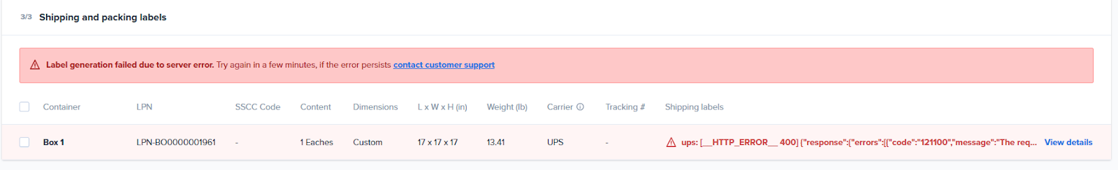 The label generation process could fail due to various reasons, such as connection issues or non-compliance with carrier requirements. Each carrier may have different requirements, such as box types, weights, etc. If, at the time of generating the labels, some of the requirements are not met, an error will be shown in the UI indicating the error reported by the carrier.