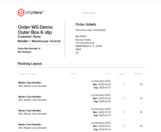 Select Print shipping labels. This generates a PDF with all required labels, each referencing the Box ID of the box it should be placed on, and updates the order status to Warehouse Complete, making the Fulfill order option available.