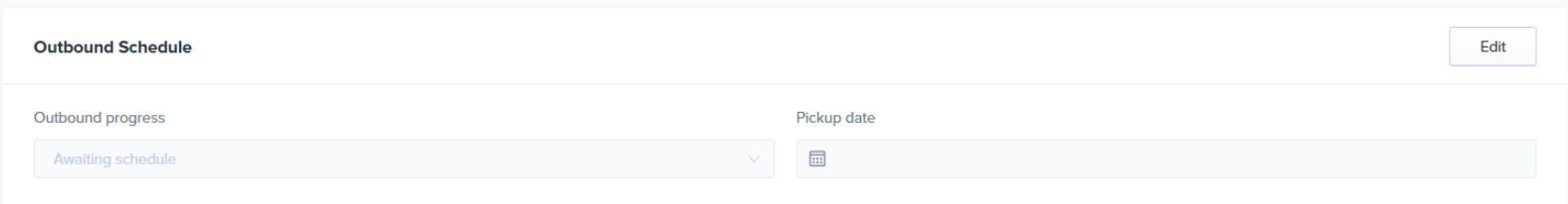The Outbound progress will default to Awaiting Schedule. Once your team schedules a pick up, change the status to Ready for pick up and enter a Pickup date. After the order has been picked up, update the Outbound progress to Complete and mark the order as fulfilled using the Fulfill order button.
