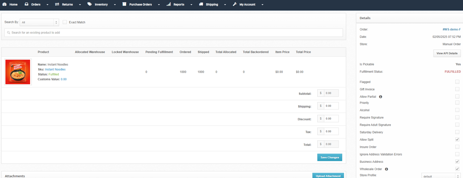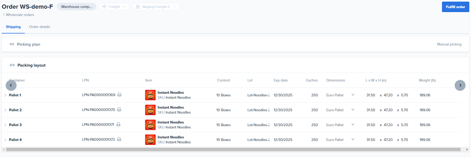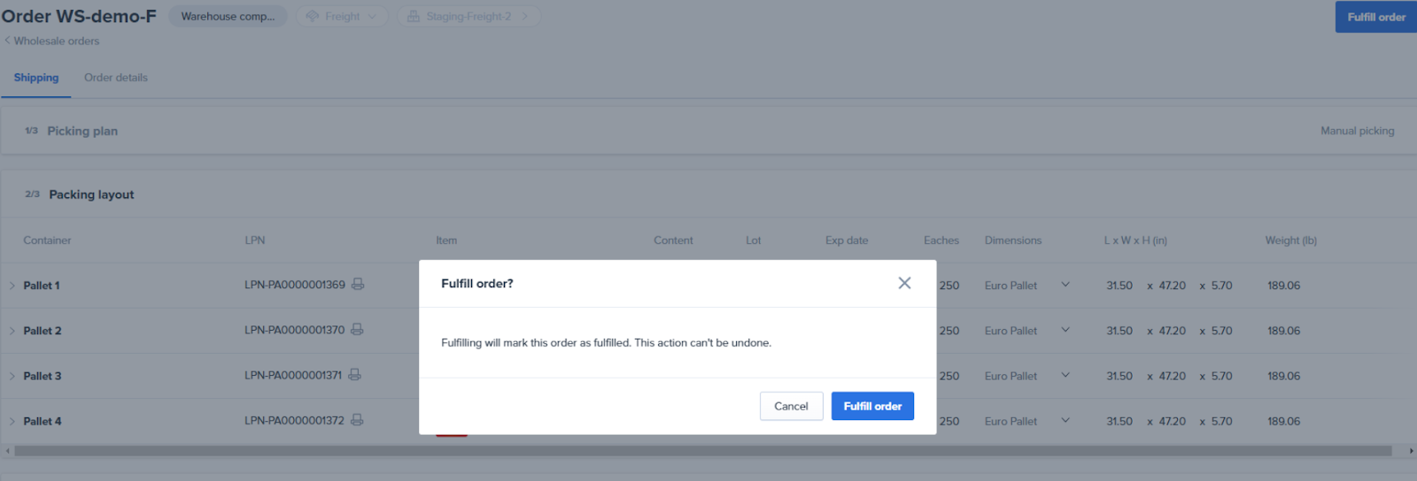 Once the Outbound process is complete, you can use the Fulfill order button to complete the wholesale flow and move the order to a Fulfilled status. This action is available after generating labels but we recommend not using it until the outbound schedule is complete and the order has left the building.
