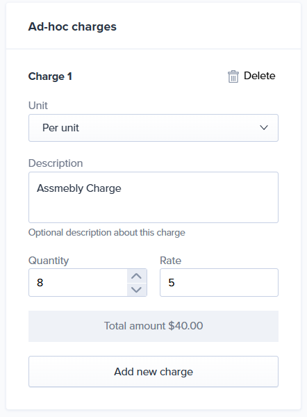 - If you need to add multiple ad-hoc charges to the same work order you can do so by selecting the Add new charge button and repeat the steps as needed.