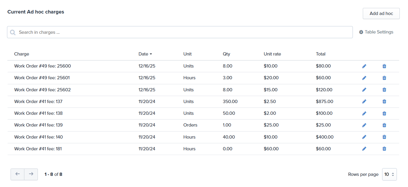 If adjustments need to be made to an existing ad-hoc charge, you must complete the edit on both platforms: the work order page and the customer's current ad-hoc charges section of their 3PL billing page.