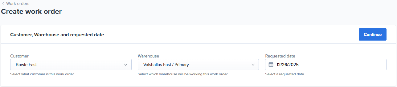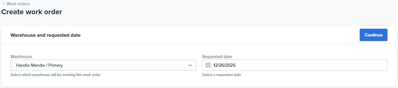 - For Multi-Warehouse Accounts: Select the Warehouse (where the work order will be completed), and the Requested date (when the work order should be completed by).