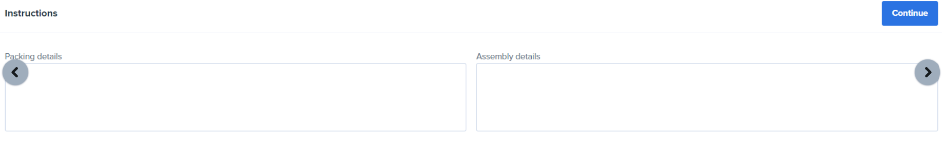 4.3. Optional: Input the Packing details and Assembly details and select Continue. If there are not required, leave the boxes blank and select Continue.