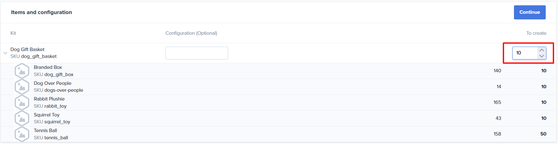 4.2. After selecting the Assembly SKU enter the quantity to create and select Continue again. The list of components listed display the Available quantity of each component SKU to best determine the number of complete kits that can be made. After the quantity to create is entered, the total quantity to pick for each component will be updated. (Reminder: Available = On hand - Allocated).