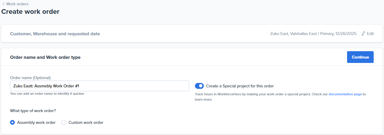 Name your work order and choose the Work order type (Assembly or Custom). If you want to track hours in WorkforceHero, enable the Create a Special Project for this work order option. More information about using Workforce Hero for Special Projects can be found here.