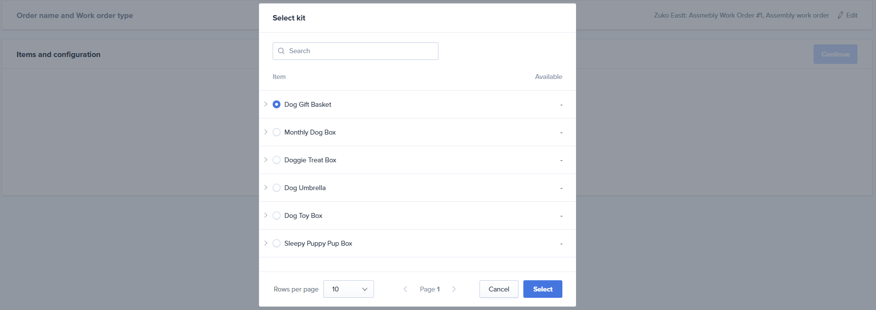 4.1. You will be prompted to choose the Assembly SKU you want to configure. Click the Select kit button and then choose the Assembly SKU from the list.