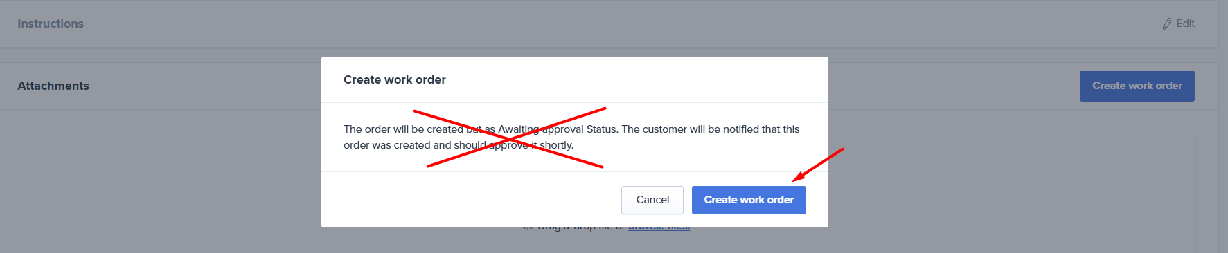 NOTE for 3PLs: Please ignore the prompt and select Create work order when creating a work order on behalf of a 3PL Client. There is no approval required from the client and work order will be created with an "In progress" status.