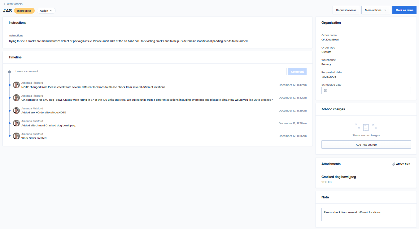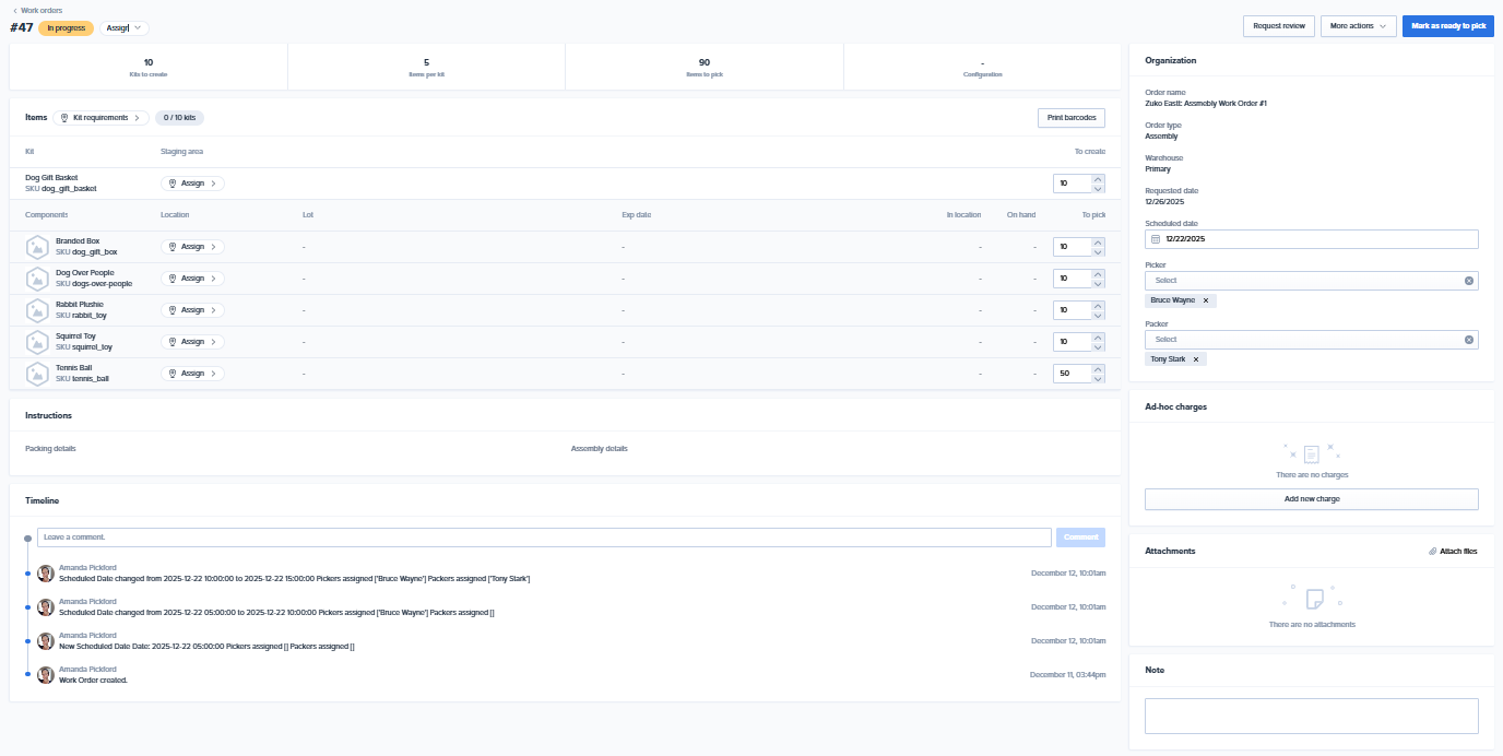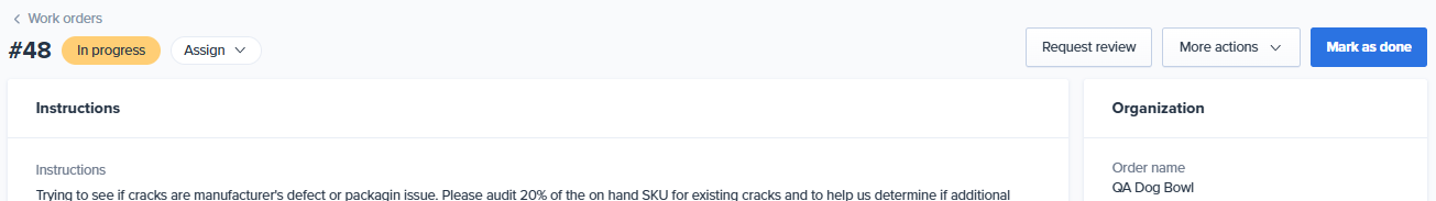 To open a work order's details page, click on the work order from the Work Orders list page. The type of work order you are processing will determine which of these sections are available. For example, Custom work orders do not show the Items section and Kit details banner like Assembly work orders do.