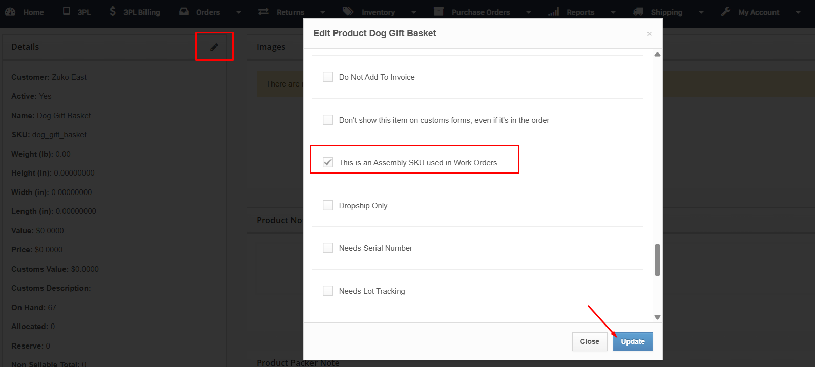 Open the product's details page and select the edit icon. Select the setting "This is an Assembly SKU used in Work Orders" and click Update.