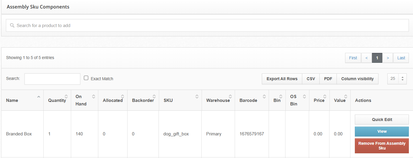 NOTE: Only SKUs that have the "Is Assembly" product setting enabled will show in this list. More information about how to configure an Assmebly SKU can be found here.
