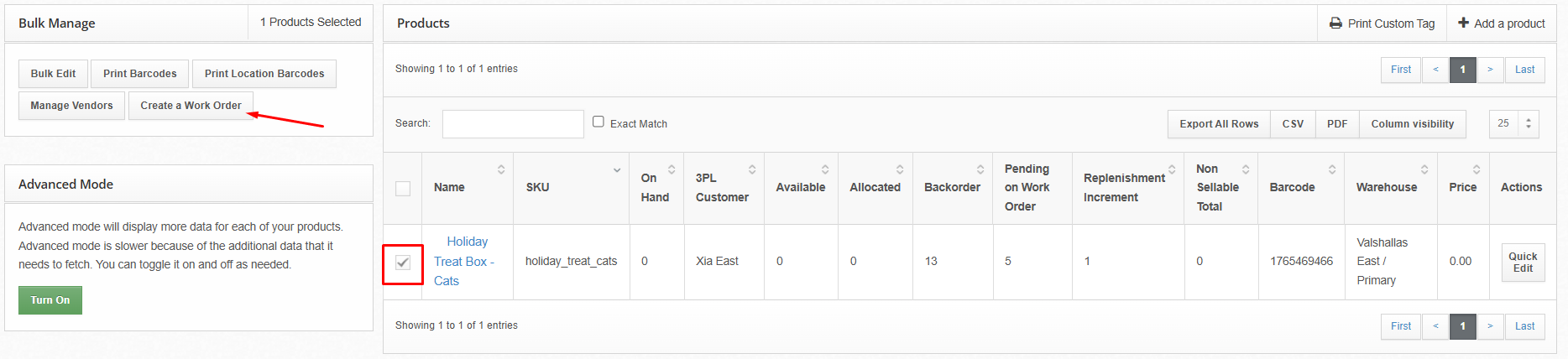 In the Bulk Manage section, click the Create a Work Order button. Work Orders for each SKU will be created automatically for the quantity that is backordered