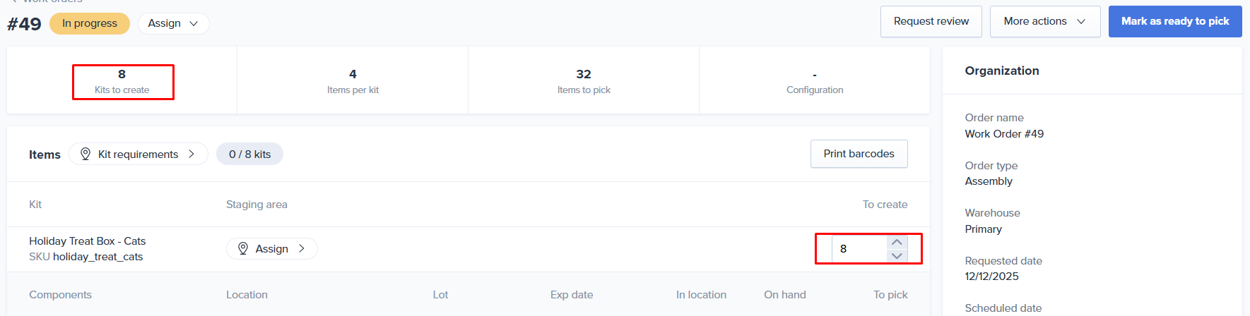 Assembly SKU - Holiday Treat Box - Cats has 13 backorders with a Pending on Work Order quantity of 5. ShipHero will subtracts the pending on work order quantity from the backordered amount to calculate the remaining quantity that needs to be created on the new work order. In this case the new work order for Holiday Treat Box - Cats is 8, 13-5=8.