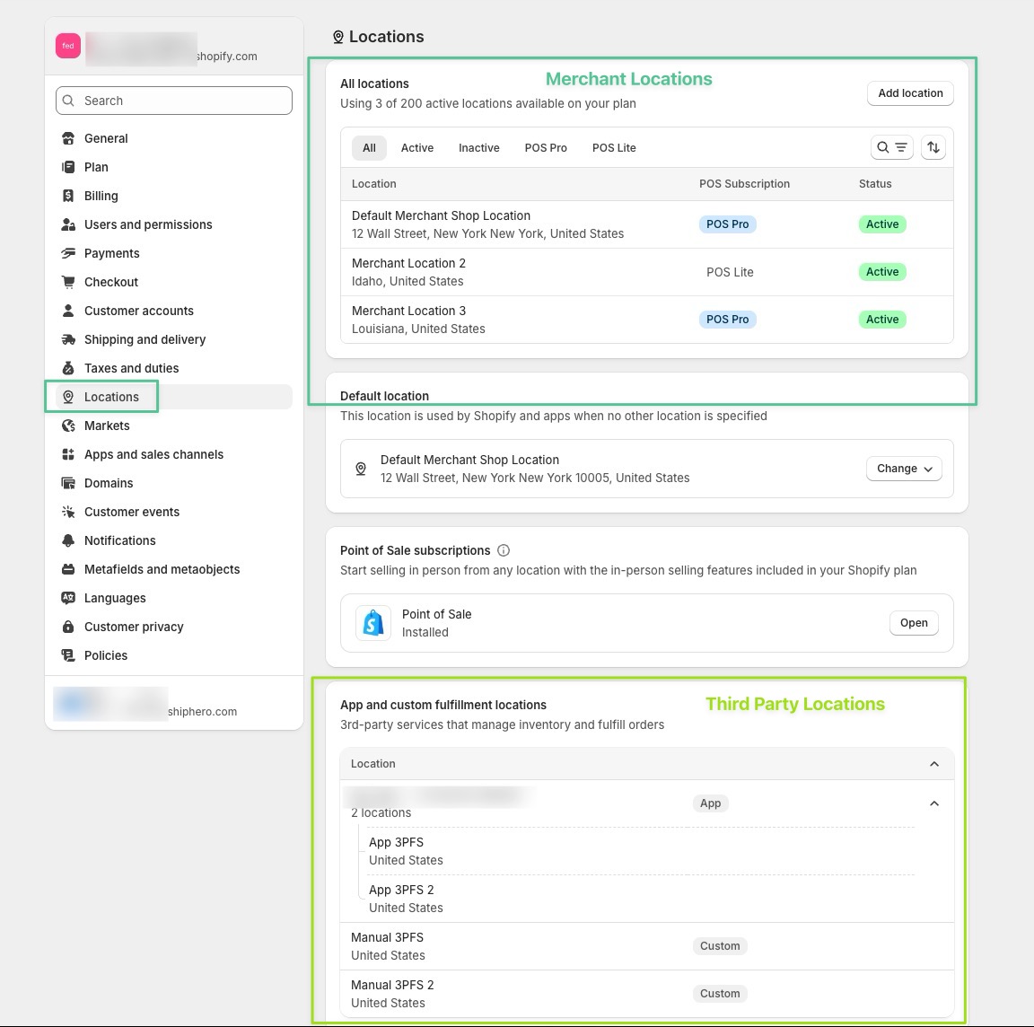 On Shopify you can see your configured Merchant and 3rd Party Locations under Settings -> Locations