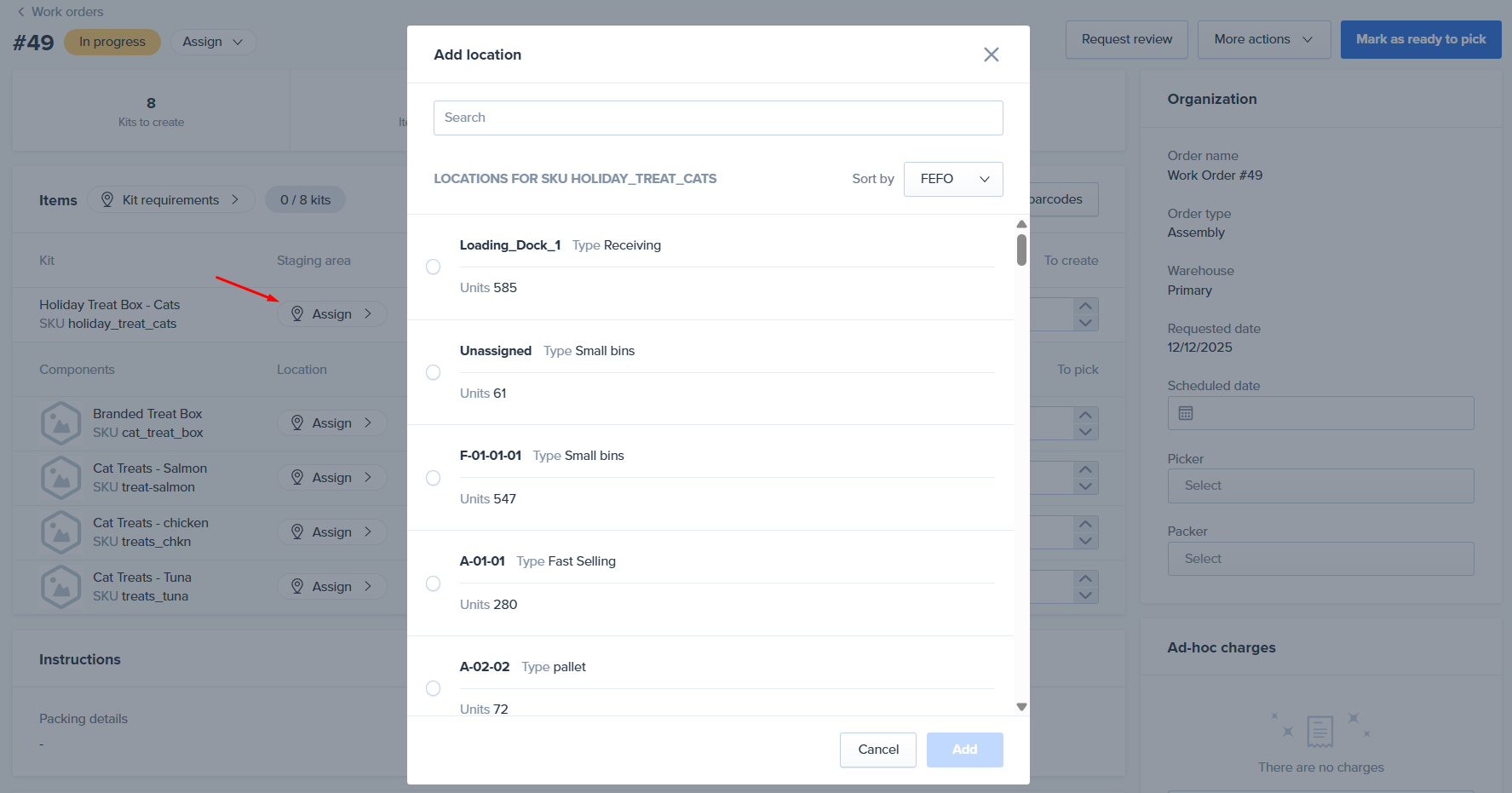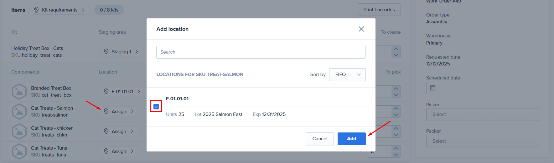 After the Staging area is selected click the Assign button next to each assembly component SKU and select the location to pick the inventory from then click Add to save the selection.