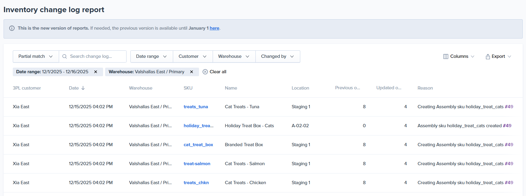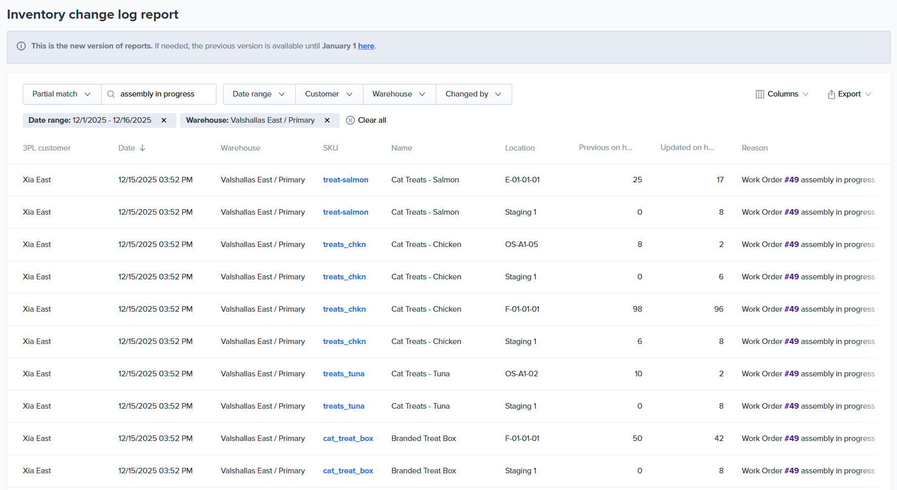 NOTE: You can view the inventory changes from when the work order is set to Assembly in progress on the Inventory Change Log report. Each SKU will have two line items on the report per picking location, the first indicating the inventory being pulled from the picking location and the second showing the inventory being added to the staging area location.