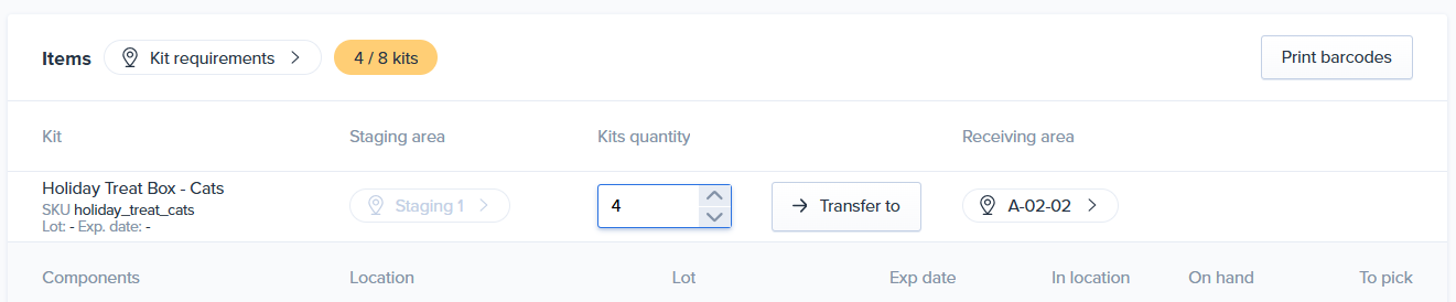 - If an Assembly SKU has a single component, both have Needs lot tracking enabled, and the selected picking location of the component has a lot assigned, the Assembly SKU will automatically inherent the lot and expiration date of the assembly component SKU.