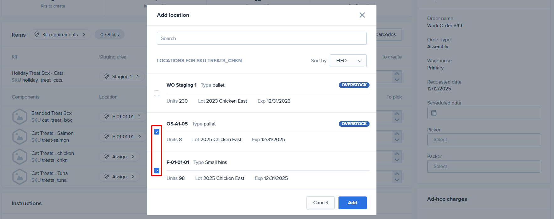 As mentioned above, multiple picking locations can be selected for a single component SKU. Check the box next to each location and then click Add. After selecting the location, enter the quantity to pick from each.