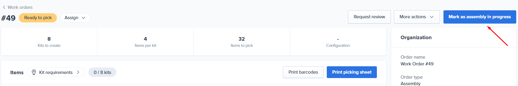 Once everything is picked and moved to the staging location, select the button Mark as assembly in progress.