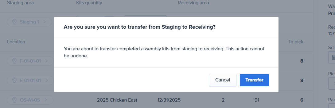 "You are about to transfer completed assembly kits from staging to receiving. This action cannot be undone." click