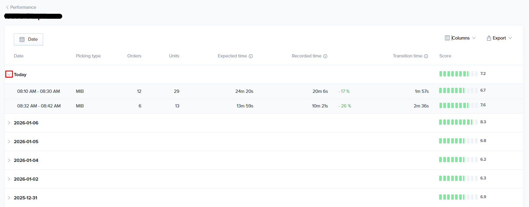 - The detailed view of the picker pperformance dahsboard groups all the batches for each day into a single line item. Select the down arrow next to the date to see metrics for each specific batch completed that day.