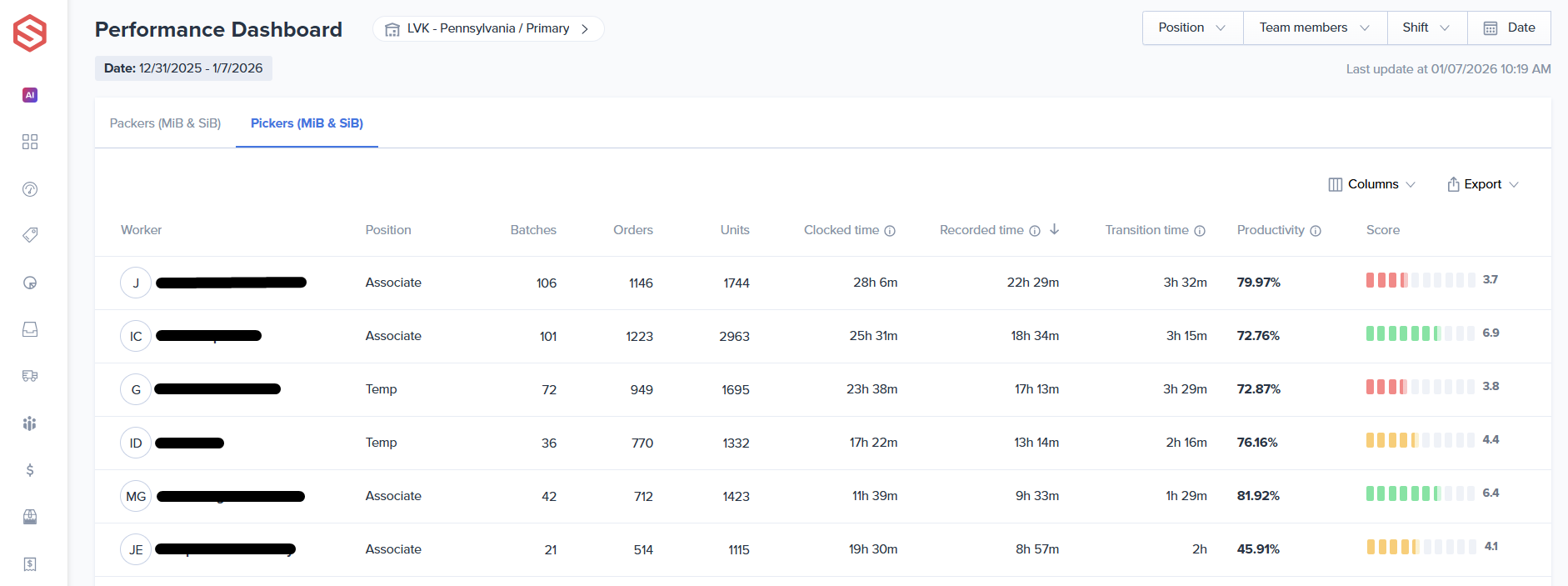 Use the Transition Time metric in tandem with the Score. If a picker has a high Score (they pick very fast) but low Productivity (they spend a lot of time in transition), they aren't the problem—your workflow is. This usually means they are waiting too long for new batches to be assigned or there is a bottleneck at the packing station. Addressing these "gaps" is often the fastest way to increase your total warehouse throughput.