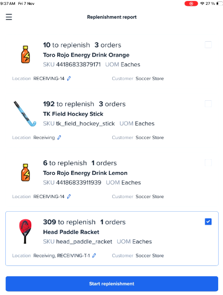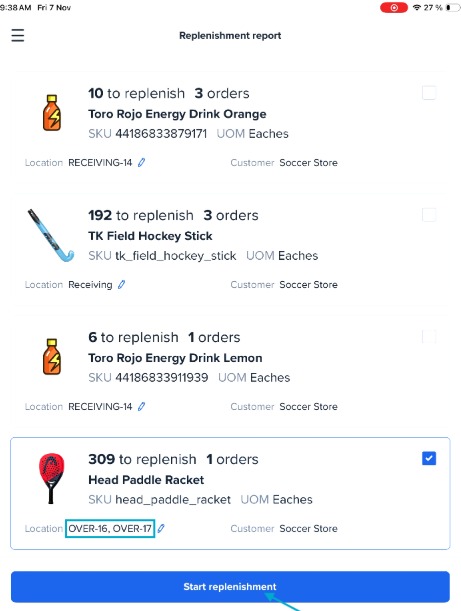 - Tap Start replenishment to view the Replenishment draft list. The app splits the total replenishment into separate tasks for each source location.